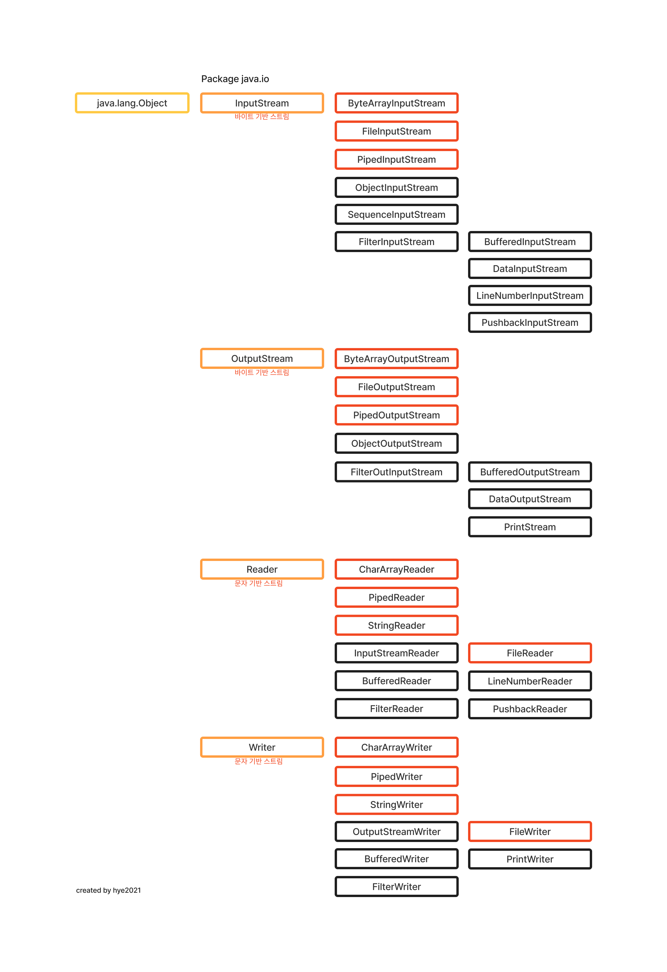 - java에서는 char형이 2byte임 → 문자 기반 스트림은 입출력의 단위가 2byte